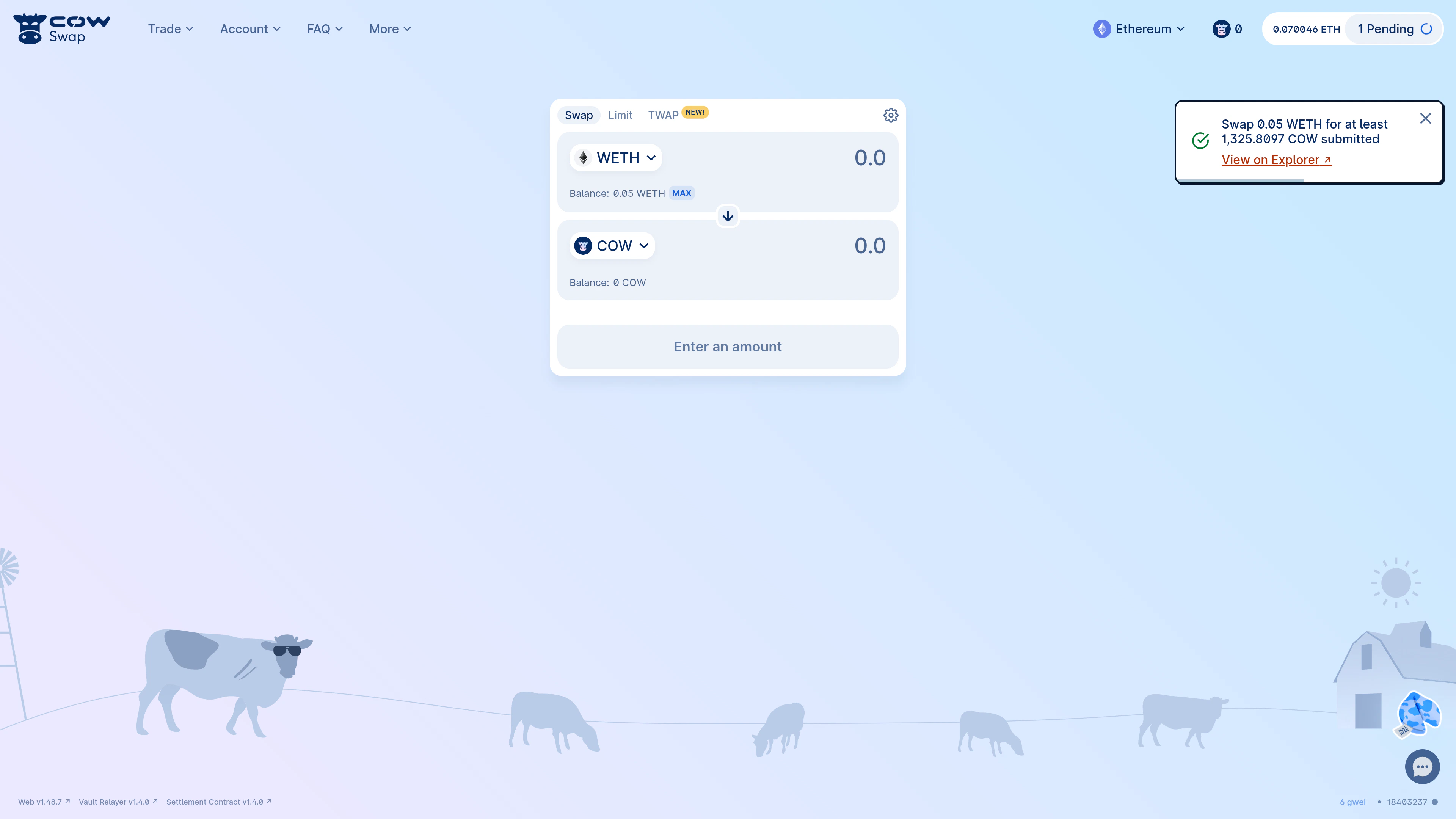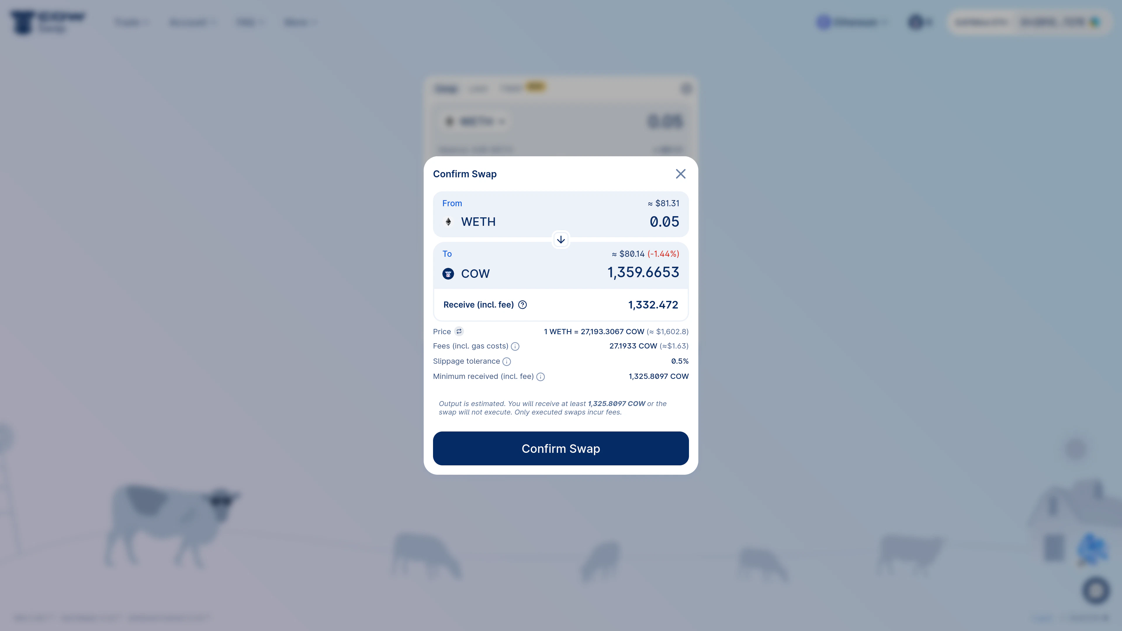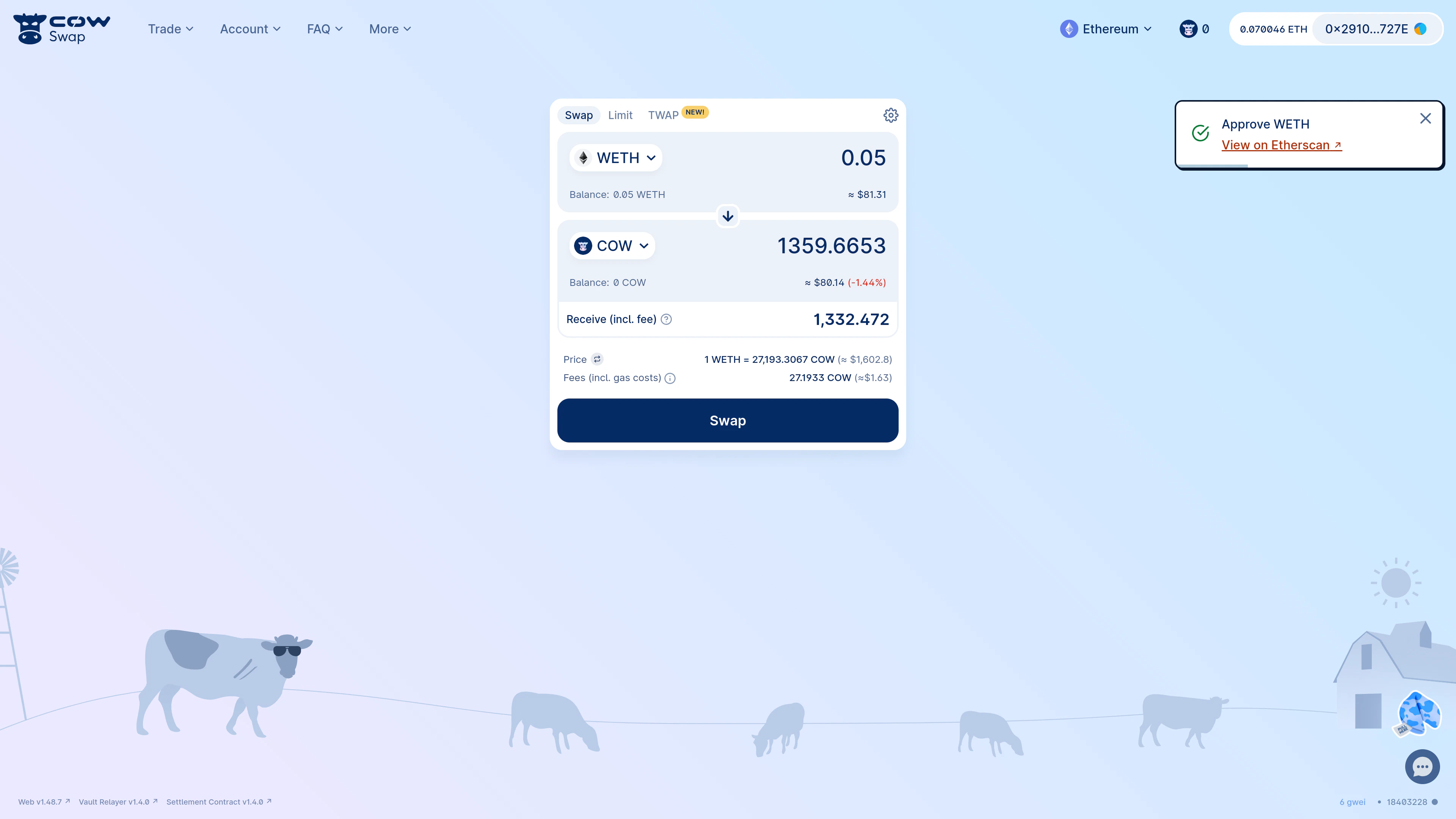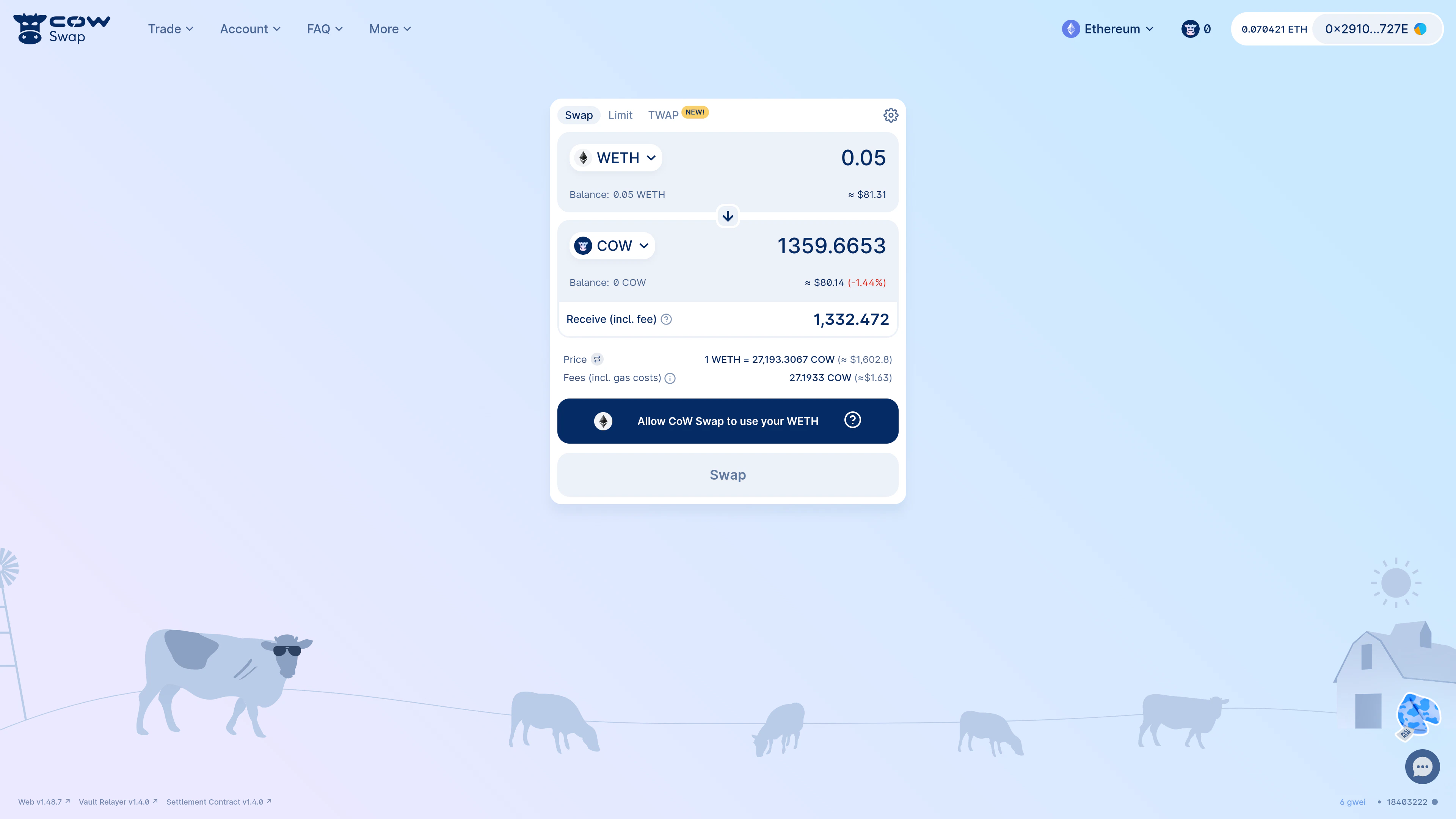 Consider an example swapping 0.05WETH for COW.