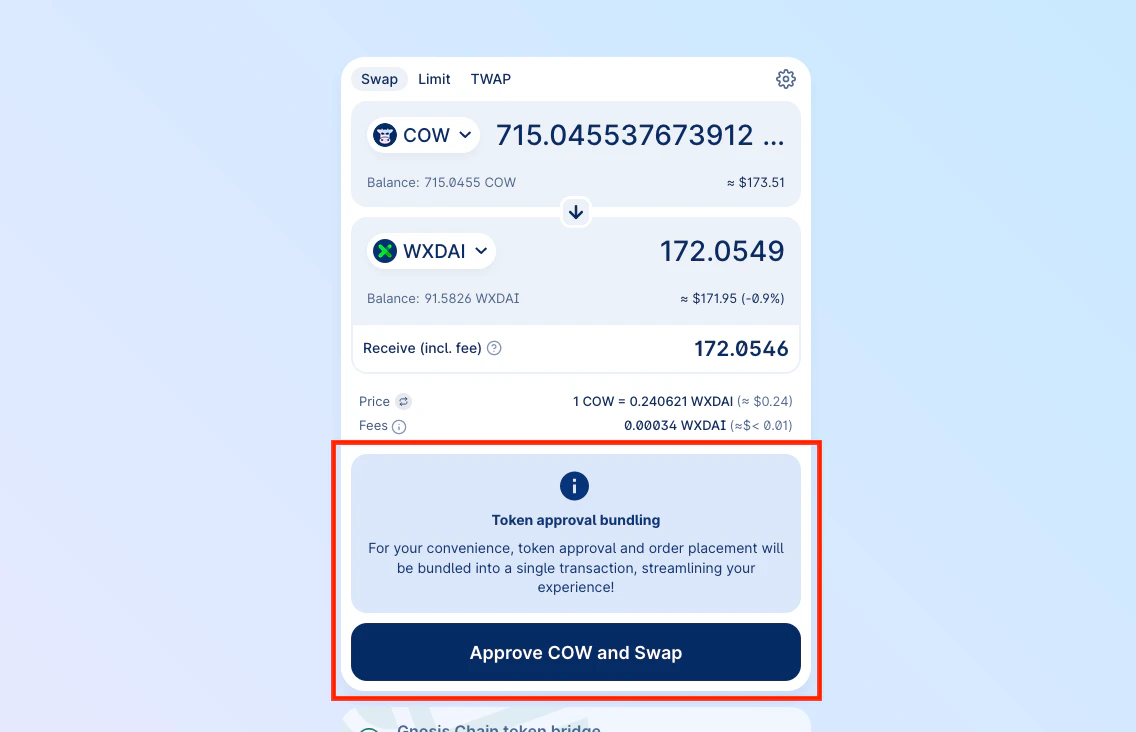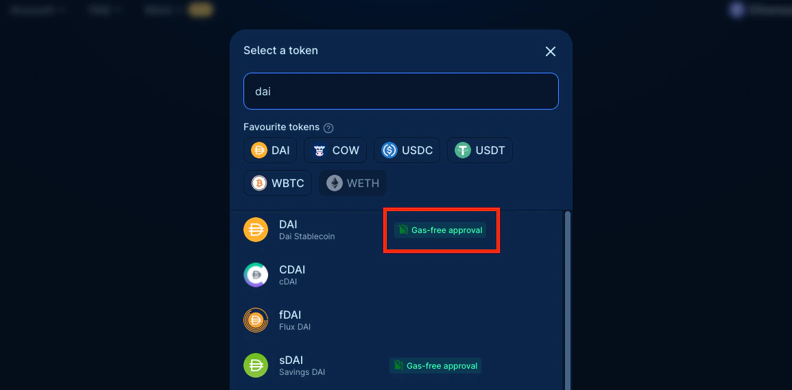 USDC, DAI, COW and many others support gasless approvals. This means that you can approve the vault relayer contract to spend your tokens without having any initial gas for an on-chain transaction. This is a great way to save on gas costs!You don’t have to worry about this, as CoW Swap will automatically detect if the token supports gasless approvals and will guide you through the process.Just look for the gasless approval flag when picking the tokens to get started: