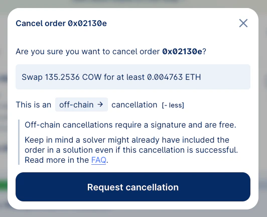 on-chain cancellation transaction. This will cost gas. To do so, toggle the type of cancellation to on-chain by clicking on off-chain.